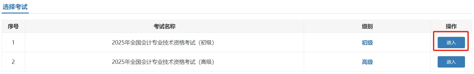 點擊“會計專業(yè)技術(shù)資格考試”,會直接進入到選擇考試界面,點擊初級考試操作列表中的“進入”按鈕進行該場考試的報名,如下圖所示: