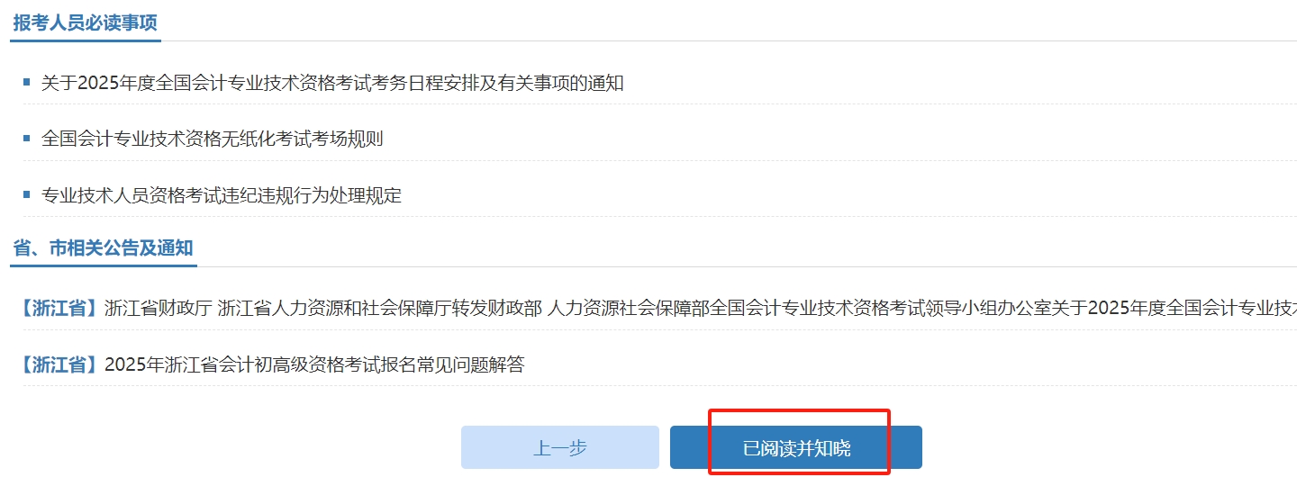 完成閱讀須知后,進入到所選擇省份設(shè)置的通知公告頁面,包括報考人員必讀事項以及省、市相關(guān)公告及通知。點擊“已閱讀并知曉”,如下圖所示: