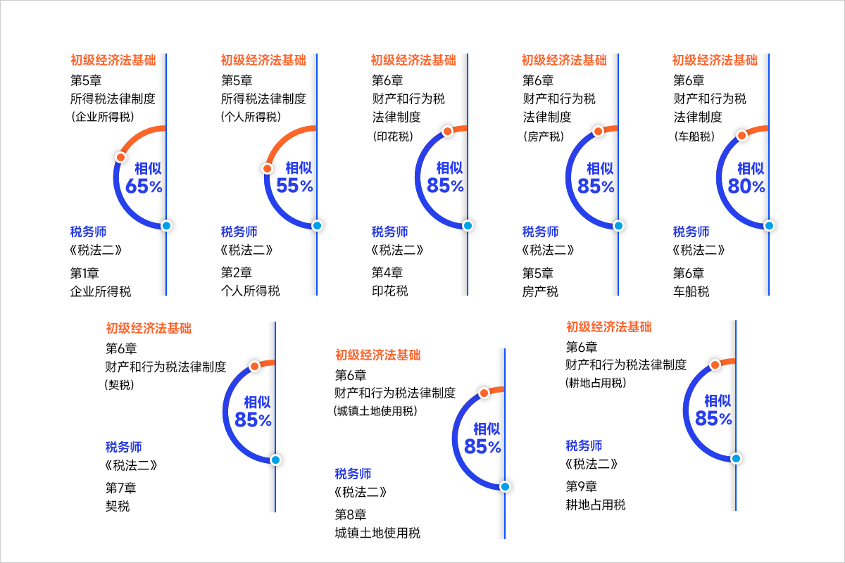 初級會計《經(jīng)濟法基礎(chǔ)》共有八章,與注會《稅法》知識對接較多,其中有六章都與注會《稅法》有對應(yīng)的相似知識點。在增值說、消費稅、企業(yè)所得稅、個人所得稅、房產(chǎn)稅、契稅、土地增值稅等核心法律制度上,更是逐一契合,這些知識內(nèi)容不論是今后的進階考試還是職場實務(wù)工作,都是不可或缺的知識儲備。