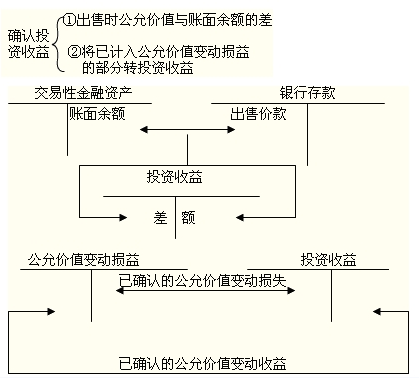 出售交易性金融資產(chǎn)時(shí),應(yīng)將出售時(shí)的公允價(jià)值與其賬面余額之間的差額確認(rèn)為當(dāng)期投資收益;同時(shí)調(diào)整公允價(jià)值變動(dòng)損益。