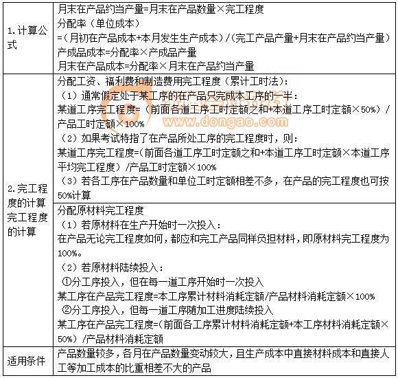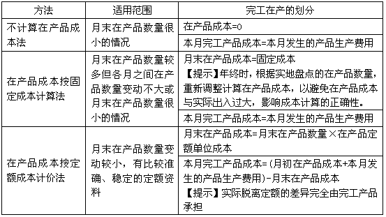 【提示】公式前兩項(xiàng)之和為待分配費(fèi)用,待分配費(fèi)用在完工產(chǎn)品與月末在產(chǎn)品之間分配有兩類方法:一是“倒擠法”,即先確定月末在產(chǎn)品成本,再用待分配費(fèi)用減月末在產(chǎn)品成本得出完工產(chǎn)品的成本;二是“分配法”,即將待分配費(fèi)用按一定比例在完工產(chǎn)品與月末在產(chǎn)品之間進(jìn)行分配。
