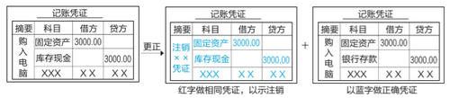 更正方法:①記賬后發(fā)現(xiàn)記賬憑證科目錯(cuò)誤的,如下圖所示更正記賬憑證,并據(jù)以分別用紅字和藍(lán)字登記入賬。