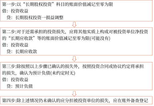 被投資單位發(fā)生凈虧損時,沖減長期股權投資賬面價值,但以“長期股權投資”科目的賬面價值減記至零為限;還需額外承擔的投資損失,依次沖減長期應收款,確認預計負債,備查簿登記,具體處理如下: