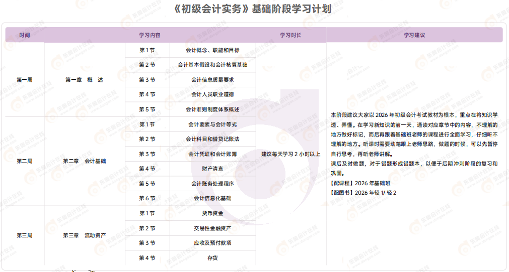 2026年初級(jí)會(huì)計(jì)考試基礎(chǔ)階段備考已經(jīng)開(kāi)啟,東奧為考生們帶來(lái)了《初級(jí)會(huì)計(jì)實(shí)務(wù)》基礎(chǔ)階段學(xué)習(xí)計(jì)劃,助力大家高效備考,快來(lái)領(lǐng)取吧!