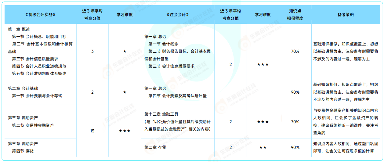 《初級(jí)會(huì)計(jì)實(shí)務(wù)》科目與注會(huì)《會(huì)計(jì)》、《財(cái)管》存在關(guān)聯(lián);初級(jí)《經(jīng)濟(jì)法基礎(chǔ)》與注會(huì)《稅法》、《經(jīng)濟(jì)法》有關(guān)聯(lián)。如果放在一起備考,在學(xué)習(xí)有關(guān)聯(lián)的科目時(shí),能更快速的理解知識(shí)點(diǎn),從而提高備考效率。以25年教材內(nèi)容為例,初級(jí)與注會(huì)相似知識(shí)點(diǎn)如下,點(diǎn)擊圖片可放大查看: