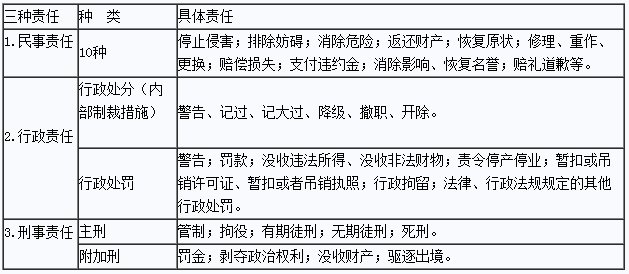 法律責(zé)任的種類:根據(jù)我國法律的有關(guān)規(guī)定,法律責(zé)任可分為民事責(zé)任、行政責(zé)任和刑事責(zé)任三種。