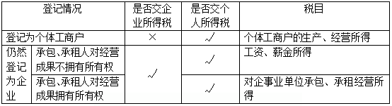(1)個人對企事業(yè)單位承包、承租經(jīng)營后,工商登記改變?yōu)閭體工商戶的,按“個體工商戶的生產(chǎn)、經(jīng)營所得”稅目征收個人所得稅,不再征收企業(yè)所得稅。
