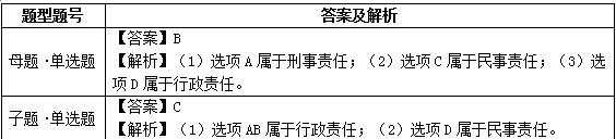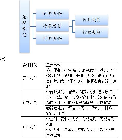 (1)根據(jù)法律的有關(guān)規(guī)定,可將法律責(zé)任分為民事責(zé)任、行政責(zé)任和刑事責(zé)任三類;其中行政責(zé)任進(jìn)一步劃分為行政處罰和行政處分。