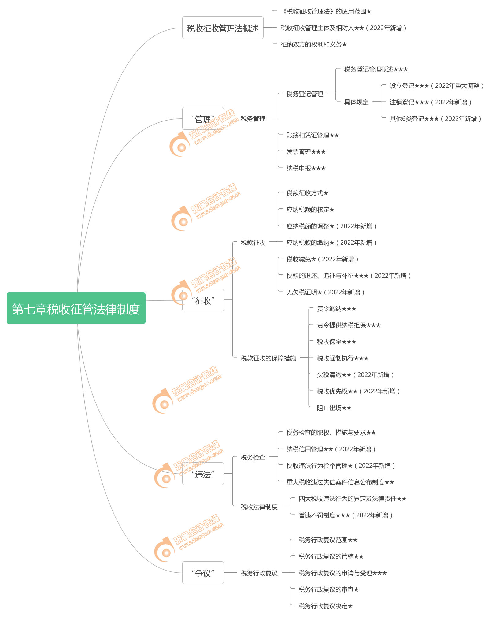2.整考點(diǎn)新增的有“應(yīng)納稅額的調(diào)整”“應(yīng)納稅款的繳納”“稅收減免”“稅款的退還、追征及補(bǔ)征”“無欠稅證明”“欠稅清繳”“稅收優(yōu)先權(quán)”“納稅信用管理”“稅收違法行為檢舉管理”“首違不罰制度”;