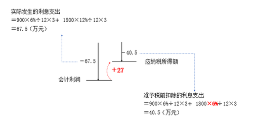 【解析】(1)向金融企業(yè)借款的利息支出,準予據(jù)實扣除,可扣除金額=900×6%÷12×3;(2)向非金融企業(yè)乙公司借款的利息支出,不超過金融企業(yè)同期同類貸款利率計算的數(shù)額的部分,準予在稅前扣除,可扣除金額=1800×6%÷12×3;(3)如果采用間接法計算應(yīng)納稅所得額,應(yīng)納稅調(diào)增27萬元[參考下圖]。