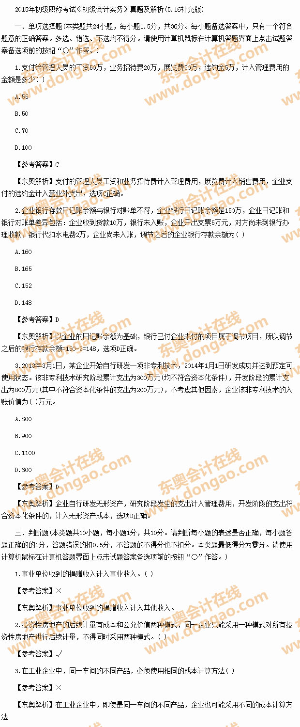 2015年《初級會計實務(wù)》真題及解析(5.16補(bǔ)充版)