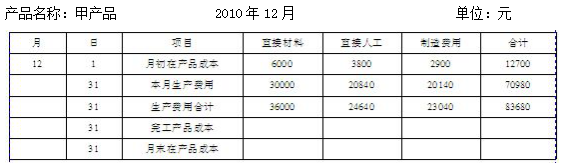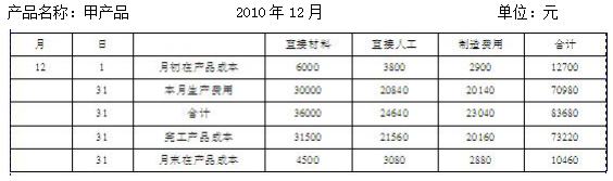 2010年12月份有關(guān)甲產(chǎn)品成本資料如下:本月完工產(chǎn)品直接材料定額成本31 500元、直接人工定額成本19 600元、定額制造費(fèi)用16 800元;月末在產(chǎn)品直接材料定額成本4 500元、直接人工定額成本2 800元、定額制造費(fèi)用2 400元。其他生產(chǎn)費(fèi)用資料見“產(chǎn)品成本明細(xì)賬”。