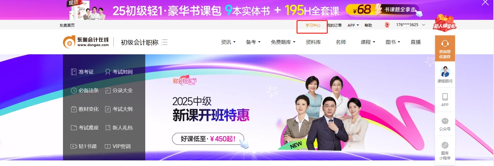 step1:進入東奧初級會計頻道(http://www.gugebb.cn/cjks/),登錄后點擊「學(xué)習(xí)中心」;