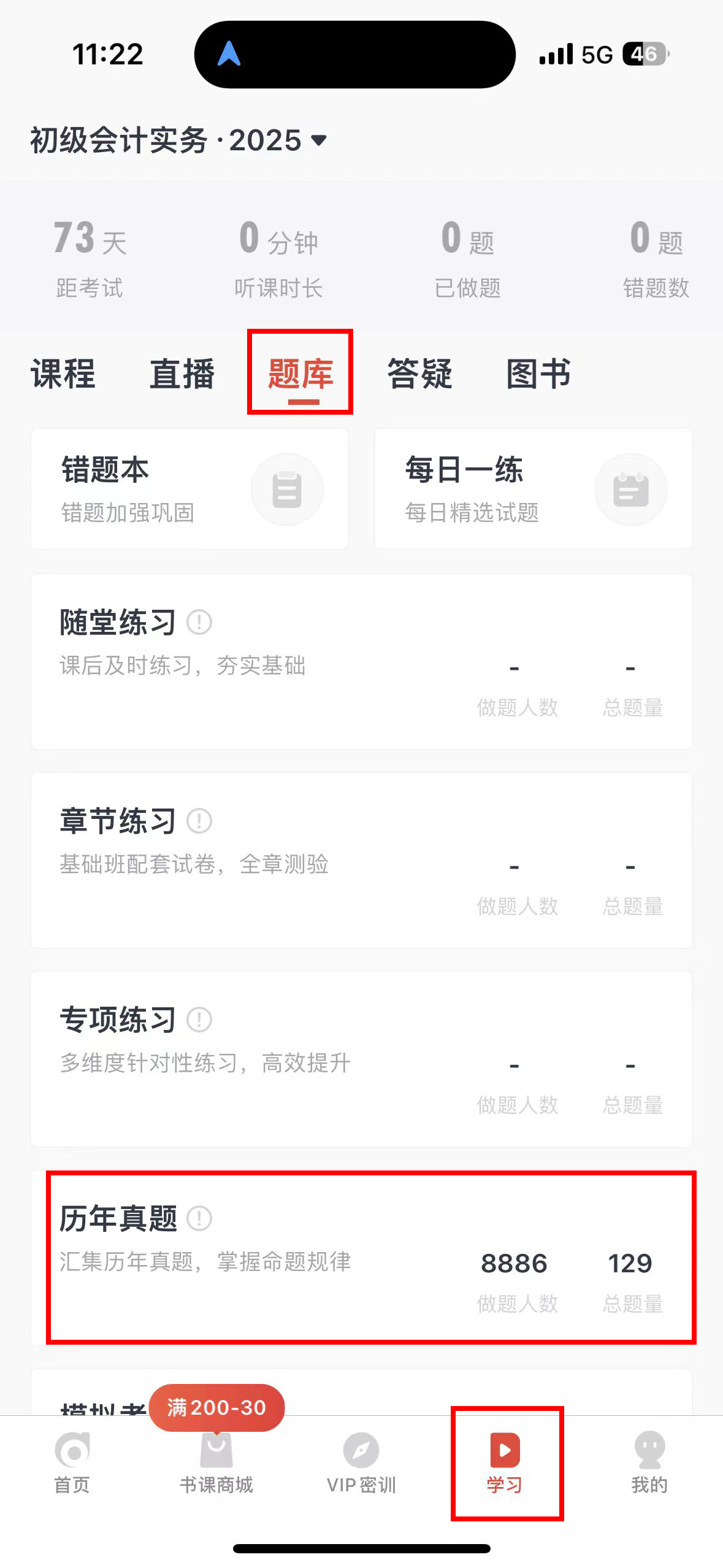 打開會計云課堂APP,點擊右下角「學(xué)習(xí)」-「題庫」-「歷年真題」,即可開始練習(xí)。
