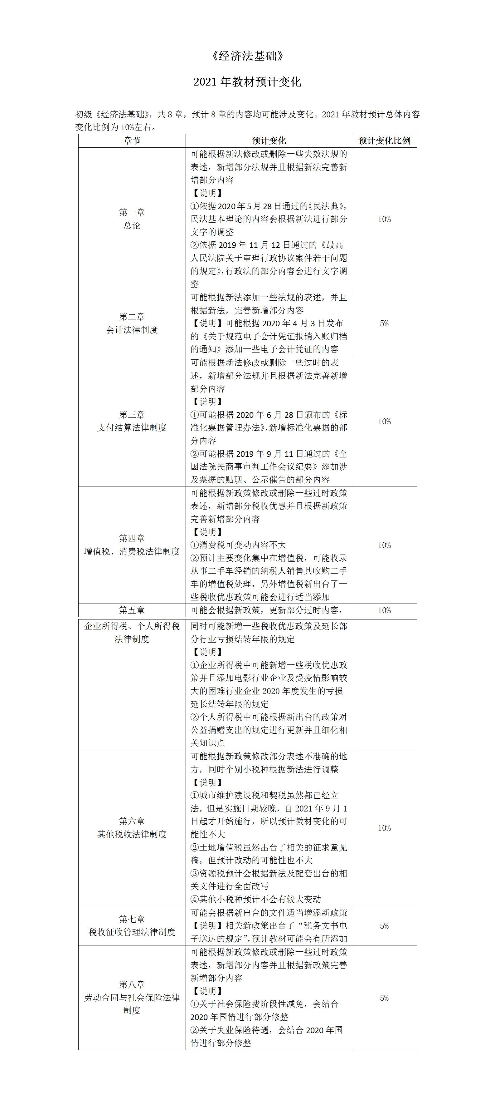 初級《經(jīng)濟法基礎(chǔ)》,共8章,預(yù)計8章的內(nèi)容均可能涉及變化。2021年教材預(yù)計總體內(nèi)容變化比例為10%左右。