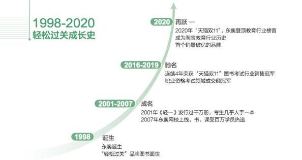 好產(chǎn)品自然引來識貨人,自1998年東奧《輕松過關(guān)》系列圖書面世以來,不僅好評如潮,銷量也是很好——2020年“天貓雙11”,東奧登頂教育行業(yè)榜首成為淘寶教育行業(yè)歷史銷售量破億的品牌。