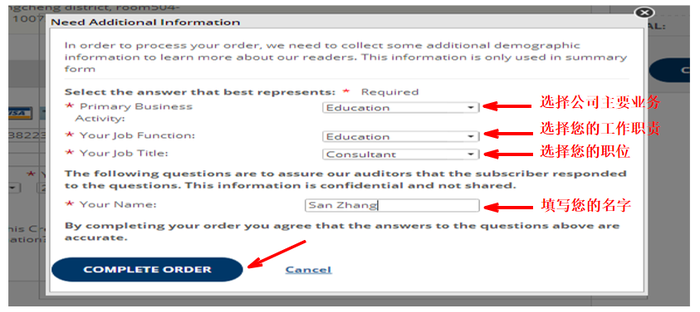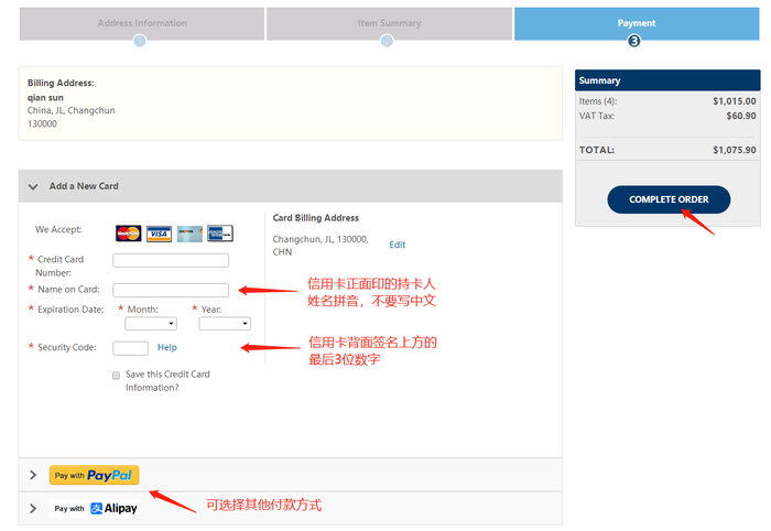 輸入visa或mastercard雙幣信用卡信息,紅色*  為必填項(xiàng),點(diǎn)擊“COMPLETE ORDER”付款