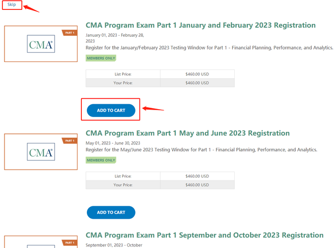 注冊(cè)一門(mén)考試,如果您想先參加第二部分考試,點(diǎn)擊頁(yè)面左上角“Skip”跳過(guò),添加第二部分考試費(fèi)
