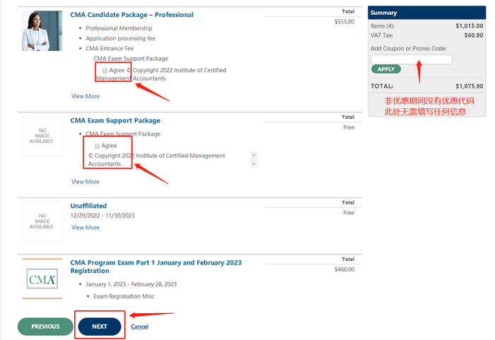 確認(rèn)購(gòu)買(mǎi)項(xiàng)目,優(yōu)惠期間可在右側(cè)輸入優(yōu)惠代碼, 點(diǎn)擊“APPLY”的按鈕,才能享受優(yōu)惠價(jià)格,并點(diǎn)擊“View More”閱讀協(xié)議,并勾選“Agree”,然后點(diǎn)擊“NEXT”