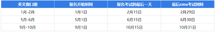 2024年cma英文報名和考試時間是什么時候?考試屬于預約式報名,每次考試報名時間并不相同,具體以官方發(fā)布時間為準。cma英文考試每年有三個窗口期,每次考試窗口開放時間為2個月,分別為1月/2月,5月/6月,9月/10月。