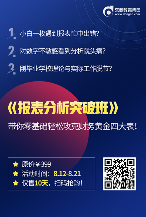 還在因?yàn)槟闶锹殘?chǎng)小白不懂報(bào)表而害怕嗎?還在因?yàn)槟銓?duì)數(shù)字不敏感而感到頭疼嗎?還在因?yàn)槟闶莿偖厴I(yè)的大學(xué)生而擔(dān)心與社會(huì)脫節(jié)嗎?針對(duì)以上考生們迫切想改變的事情,東奧CMA特別推出了《報(bào)表分析突破班》課程,由名師助力,為您排憂解難,帶你零基礎(chǔ)輕松攻克財(cái)務(wù)黃金四大報(bào)表!