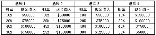 選項1預期現(xiàn)金流量=$50000×0.1+$75000×0.2+$100000×0.4+$150000×0.3=$5000+$15000+$40000+$45000=$105000。