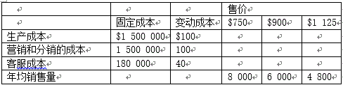 Huzdom公司采用生命周期法來計算產(chǎn)品成本,其生命周期為5年,研發(fā)費用是$1 000 000,設計和檢測費用是$2 000 000。在不同的銷售價格下年固定成本和單位變動成本如下所示:
