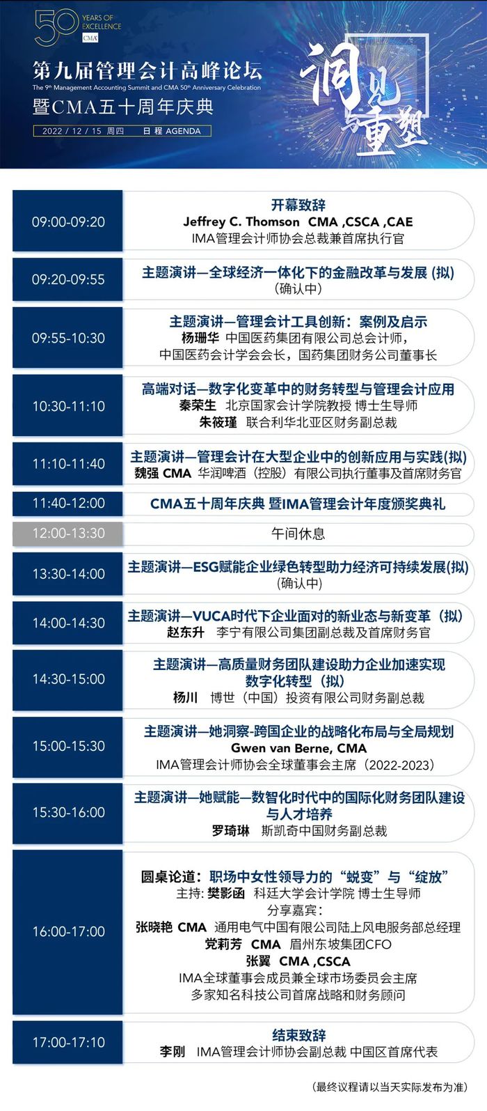 作為年度值得期待的管理會(huì)計(jì)盛事之一,第九屆管理會(huì)計(jì)高峰論壇暨CMA五十周年慶典將于2022年12月15日(周四)正式拉開帷幕。自線上報(bào)名直播通道開啟以來,已受到廣泛關(guān)注,報(bào)名仍在火熱進(jìn)行中。本屆高峰論壇將圍繞“洞見與重塑”展開,眾多重量級(jí)大咖將齊聚一堂,共享智慧盛宴。CMA持證者完整參與更可以獲得8個(gè)CPE學(xué)分。
