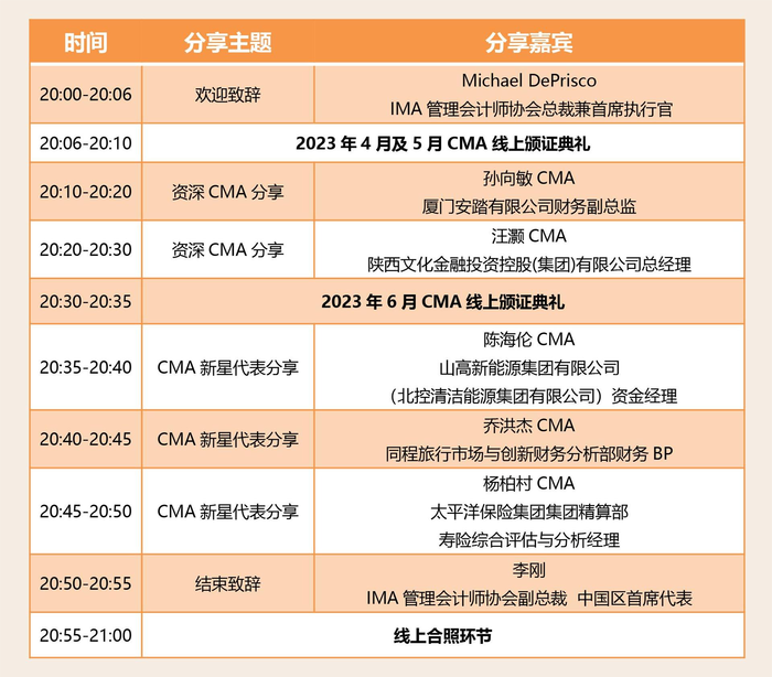 在這個(gè)金秋送爽,疊翠流金的八月,又一批財(cái)務(wù)管理專業(yè)人士加入了cma大家庭!為祝賀新晉持證者獲得cma取證證書,并給即將參加考試的考生分享備考經(jīng)驗(yàn)以及學(xué)習(xí)心得,助力管理會(huì)計(jì)專業(yè)人士開啟全新的職業(yè)旅程,IMA管理會(huì)計(jì)師協(xié)會(huì)將定于8月30日(周三)晚間20:00-21:00舉辦2023cma夏季線上頒證典禮。本次活動(dòng)將采用線上直播方式進(jìn)行,歡迎屆時(shí)登錄相關(guān)頁面觀看直播、參與互動(dòng)。