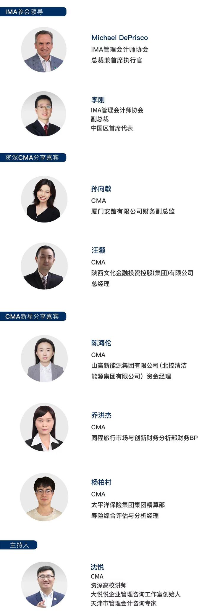 本次活動(dòng)中,IMA總裁兼首席執(zhí)行官M(fèi)ichael DePrisco先生、IMA副總裁兼中國(guó)區(qū)首席代表李剛先生將在線上和與會(huì)者溝通交流。同時(shí),我們也將邀請(qǐng)到兩位資深cma持證者:廈門安踏有限公司財(cái)務(wù)副總監(jiān)孫向敏女士,陜西文化金融投資控股(集團(tuán))有限公司總經(jīng)理汪灝先生帶來他們深耕管理會(huì)計(jì)領(lǐng)域多年來的心得體會(huì),以及管理會(huì)計(jì)在實(shí)踐過程中的知識(shí)運(yùn)用經(jīng)驗(yàn)與價(jià)值體現(xiàn)。除此之外,還將有三位新晉優(yōu)秀cma持證者受邀與大家見面,分享他們與cma證書的故事、成功備考經(jīng)驗(yàn),以及給考生的建議,精彩內(nèi)容切勿錯(cuò)過!