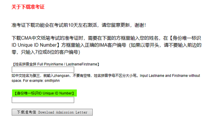 第二步:點(diǎn)擊查詢和下載準(zhǔn)考證,在第一個文本框輸入姓名的全拼,第二個文本框輸入IMA會員號(不要輸入會員號前面的0,只輸入后面7位或8位的編號),點(diǎn)擊下載即可,下載的準(zhǔn)考信需要打印出來,考試的時候與身份證一起帶進(jìn)考場。
