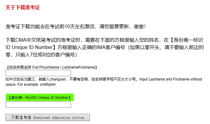 第二步:在空格內(nèi)輸入考生本人的姓名全拼、IMA會員號(不要輸入會員號前面的0,只輸入后面7位或8位的編號),選擇準考證并下載。