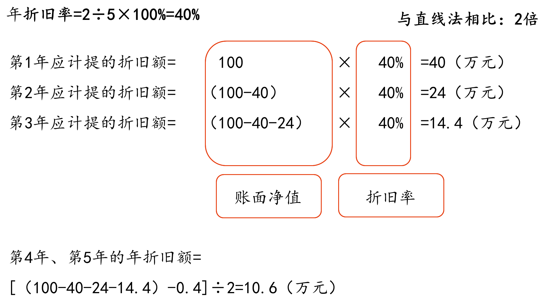 4.年數總和法(又稱年限合計法) | 年折舊率=尚可使用壽命÷預計使用壽命的年數總和×100% 月折舊率=年折舊率÷12 月折舊額=(固定資產原價-預計凈殘值)×月折舊率 |