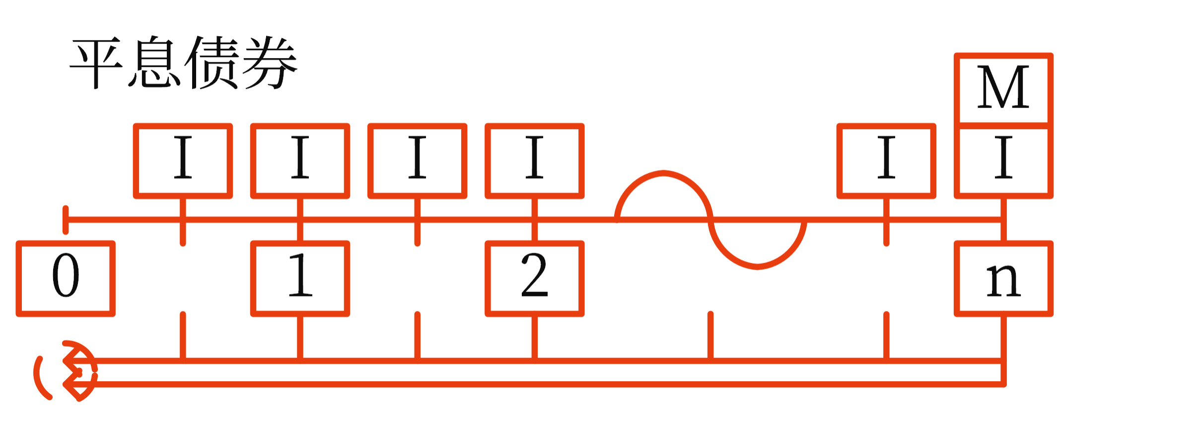 假設(shè)C=2。平息債券在0時(shí)點(diǎn)買入,在第0.5、1、1.5、2、…、n時(shí)點(diǎn)(年)均可以收到支付的利息(面值×票面利率/2),在第n時(shí)點(diǎn)(年)還可以收到兌付的債券本金,即: