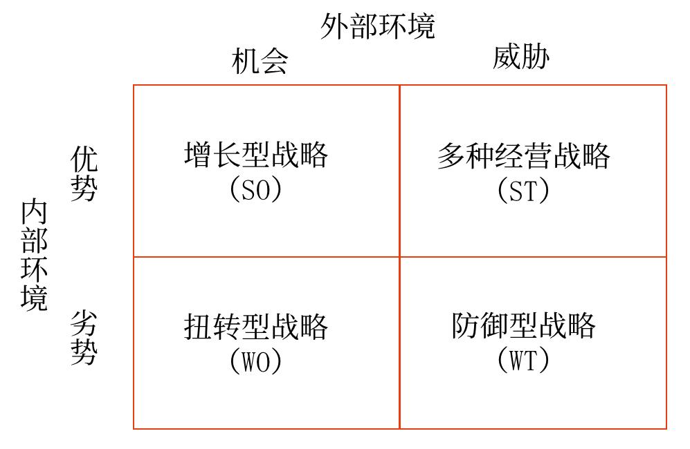 在對企業(yè)的內(nèi)外部環(huán)境分析之后,需要一個分析工具對上述分析內(nèi)容進行綜合,這就是SWOT分析。SWOT分析是對企業(yè)的內(nèi)部條件和外部環(huán)境的各方面內(nèi)容進行綜合概括,通過分析企業(yè)內(nèi)部的優(yōu)勢和劣勢及外部面臨的機會和威脅,進而幫助企業(yè)進行戰(zhàn)略選擇的一種方法。