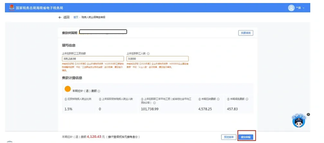 納稅人可對上年在職職工工資總額、上年在職職工人數(shù)、減免性質(zhì)等數(shù)據(jù)進行填寫和修改,確認無誤后點擊“提交申報”,進入申報提交頁面,申報成功后跳轉(zhuǎn)申報結(jié)果反饋頁面。