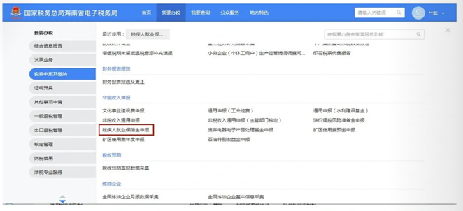 (1)登陸電子稅務(wù)局,點擊“殘疾人就業(yè)保障金申報”。