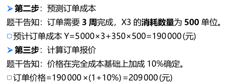因?yàn)?000是周固定成本,每周是5000,3周就是5000*3,但是后邊的部分是直接按照消耗量來(lái)計(jì)算的,不是按照周計(jì)算的,每多一個(gè)消耗量就多一個(gè)350,所以500消耗量對(duì)應(yīng)的訂單變動(dòng)成本就是500*350,您可以類(lèi)比混合成本的計(jì)算公式,Y =固定成本+產(chǎn)量*單位變動(dòng)成本,固定成本假設(shè)是按周計(jì)算的,那我們需要用固定成本*周數(shù),算總的固定成本,但是變動(dòng)成本直接使用單位變動(dòng)成本*期間內(nèi)對(duì)應(yīng)的總產(chǎn)量就可以了,不需要再去考慮周數(shù)。