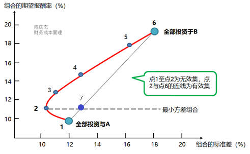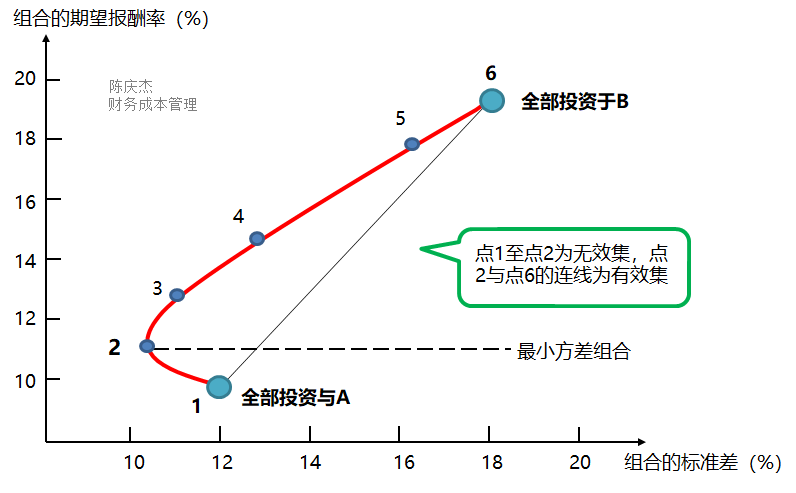 您看,隨便選擇1-2上的任何一點,在風險相同的情況下,有比它收益更高的點,所以一定不會選擇下面1-2上的點,而會選擇上面2-6上的點。
