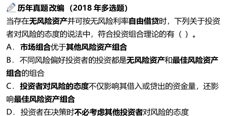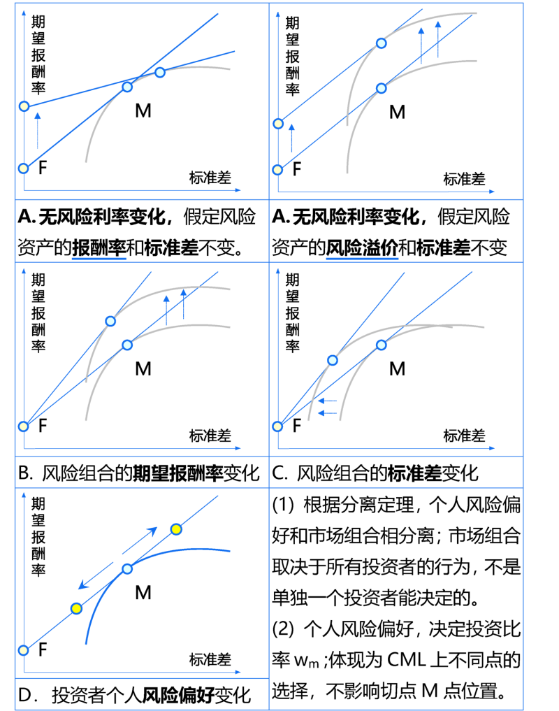 因為組合報酬率=無風(fēng)險收益+(市場組合收益率-無風(fēng)險收益率)/風(fēng)險組合的標(biāo)準(zhǔn)差*標(biāo)準(zhǔn)差,無風(fēng)險收益率上升,市場組合收益率等額上升,風(fēng)險資產(chǎn)的風(fēng)險溢價和標(biāo)準(zhǔn)差不變,所以公式中只有截距上升,其他都不變,整個圖像是向上平移的。