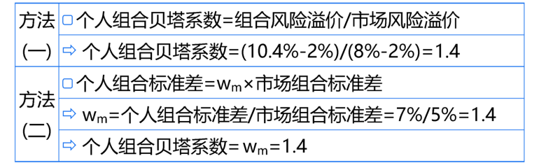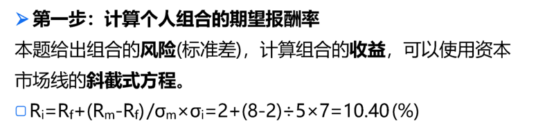 因?yàn)楸绢}說假設(shè)存在無風(fēng)險(xiǎn)資產(chǎn)并可以按照無風(fēng)險(xiǎn)利率自由借貸,說明本題滿足資本市場(chǎng)線,在資本市場(chǎng)線下,個(gè)人投資組合就是無風(fēng)險(xiǎn)資產(chǎn)和市場(chǎng)組合的再組合,個(gè)人投資組合的貝塔系數(shù)=投資無風(fēng)險(xiǎn)資產(chǎn)的比重*無風(fēng)險(xiǎn)資產(chǎn)的貝塔系數(shù)+投資市場(chǎng)組合的比重*市場(chǎng)組合的貝塔系數(shù),無風(fēng)險(xiǎn)資產(chǎn)的貝塔系數(shù)=0,市場(chǎng)組合的貝塔系數(shù)=1,則個(gè)人投資組合的貝塔系數(shù)=投資無風(fēng)險(xiǎn)資產(chǎn)的比重*,0+投資市場(chǎng)組合的比重*1=投資市場(chǎng)組合的比重。