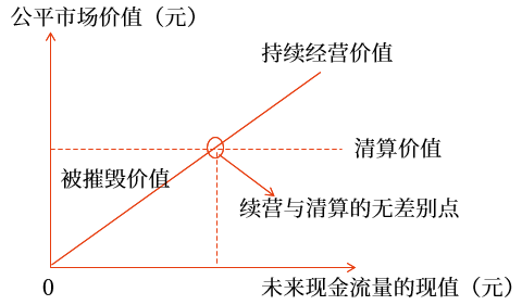 持續(xù)經(jīng)營價值 與 清算價值 | 持續(xù)經(jīng)營價值是指由營業(yè)所產(chǎn)生的未來現(xiàn)金流量現(xiàn)值。是一種整體價值 (整體功能只有在持續(xù)經(jīng)營中才能體現(xiàn)) | 1.一個企業(yè)的公平市場價值,應(yīng)當(dāng)是持續(xù)經(jīng)營價值與清算價值較高的一個 2.持續(xù)經(jīng)營條件:持續(xù)經(jīng)營價值>清算價值,若續(xù)營價值<清算價值,應(yīng)當(dāng)進行清算 但是,也有例外,那就是控制企業(yè)的人拒絕清算,企業(yè)得以持續(xù)經(jīng)營。這種持續(xù)經(jīng)營,將持續(xù)削減股東本來可以通過清算得到的價值 |