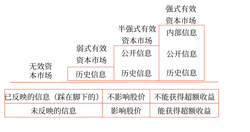 強(qiáng)式 有效 | 歷史信息 公開信息 內(nèi)部信息 | 內(nèi)部信息獲得者參與交易能否獲得超額收益 | 技術(shù)分析 估值模型 基本面分析 內(nèi)幕交易 |