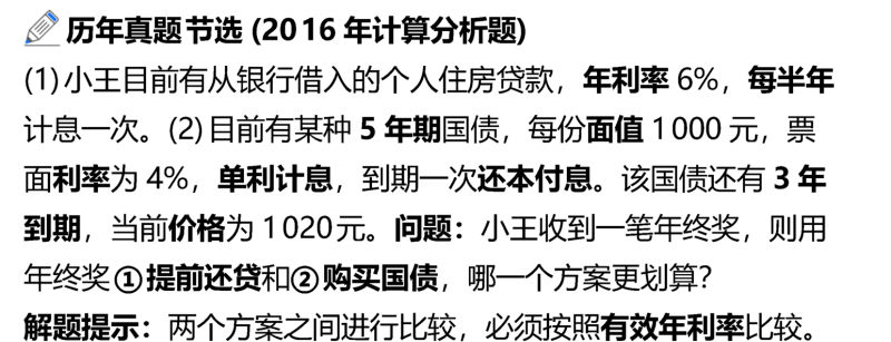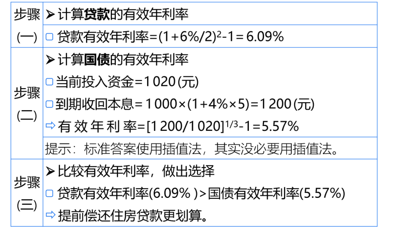 提前還貸相當于節(jié)省了6.09%的貸款利息成本,而購買國債只能獲得5.57%的回報。由于節(jié)省的成本高于投資的收益,所以應(yīng)選擇提供還貸。