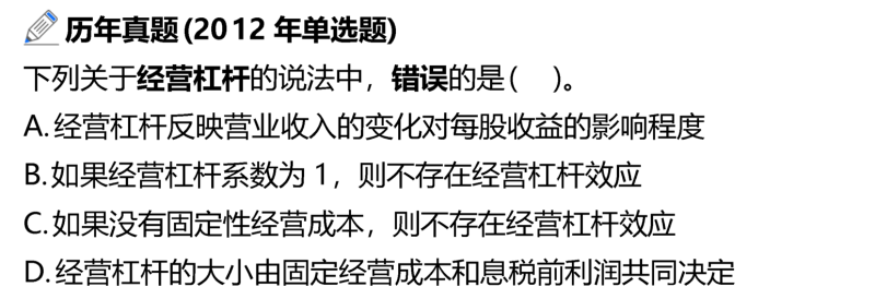 經(jīng)營杠桿系數(shù)=邊際貢獻/息稅前利潤=(息稅前利潤+固定經(jīng)營成本)/息稅前利潤=1+固定經(jīng)營成本/息稅前利潤。