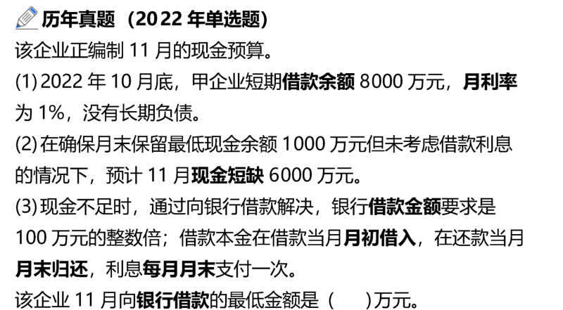 在確保月末保留最低現(xiàn)金余額1000萬元但未考慮借款及其利息 的情況下,預計7月現(xiàn)金短缺6000萬元?!馑际钦f:期初現(xiàn)金余額+本期現(xiàn)金收入-本期現(xiàn)金支出-期末現(xiàn)金余額=-6000