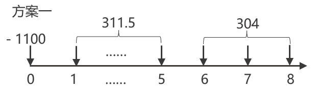 (2)方案一的凈現(xiàn)值=-1100+311.5×(P/A,12%,5)+304×(P/A,12%,3)×(P/F,12%,5)=437.18(萬(wàn)元)