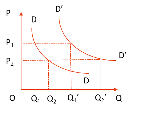 假定其他因素不變,只考慮需求和價(jià)格的關(guān)系,則需求量的變化是沿著既定的需求曲線進(jìn)行的 | 假定價(jià)格不變,由于消費(fèi)者收入或消費(fèi)者偏好以及預(yù)期等因素的變化引起需求的相應(yīng)變化,則表現(xiàn)為需求曲線的位移 |
