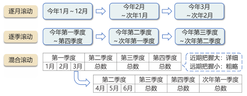含義 | 是指企業(yè)根據(jù)上一期預(yù)算執(zhí)行情況和新的預(yù)測(cè)結(jié)果,按既定的預(yù)算編制周期和滾動(dòng)頻率,對(duì)原有的預(yù)算方案進(jìn)行調(diào)整和補(bǔ)充、逐期滾動(dòng)、持續(xù)推進(jìn)的預(yù)算編制方法。這種方法將預(yù)算期與會(huì)計(jì)期間脫離開(kāi),使預(yù)算期始終保持為一個(gè)固定長(zhǎng)度 |