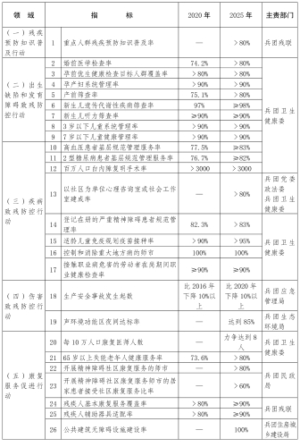 到2025年,覆蓋兵團(tuán)經(jīng)濟(jì)社會發(fā)展各領(lǐng)域的殘疾預(yù)防政策體系進(jìn)一步完善,全人群全生命周期殘疾預(yù)防服務(wù)網(wǎng)絡(luò)更加健全,全民殘疾預(yù)防素養(yǎng)明顯提升,遺傳和發(fā)育、疾病、傷害等主要致殘因素得到有效防控,殘疾康復(fù)服務(wù)狀況持續(xù)改善,殘疾預(yù)防主要指標(biāo)高于全國平均水平。